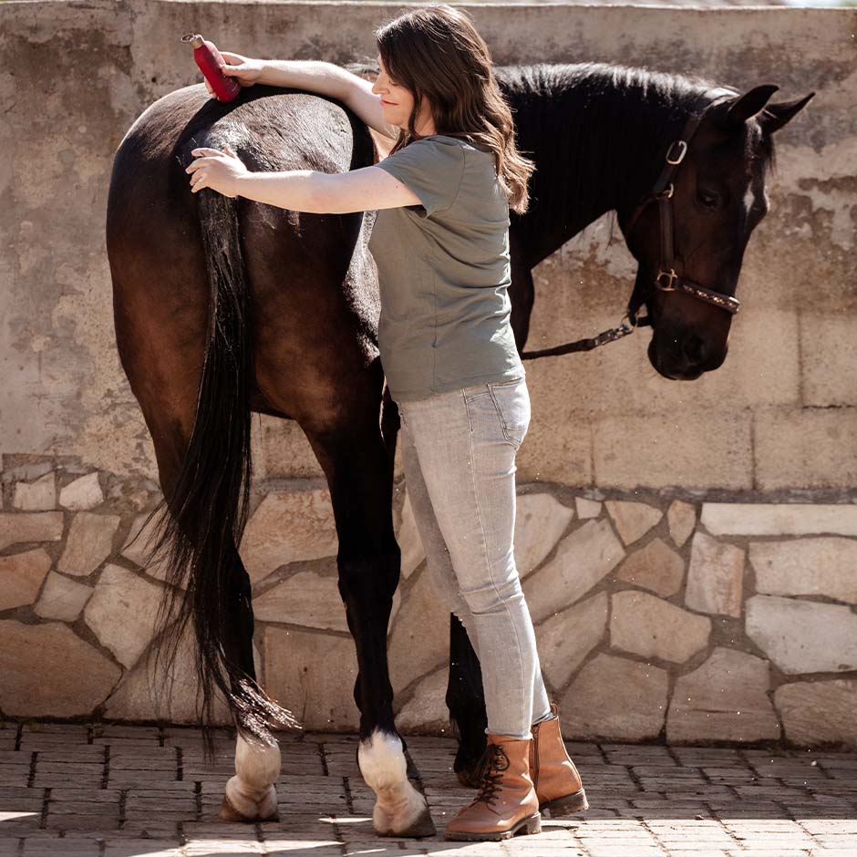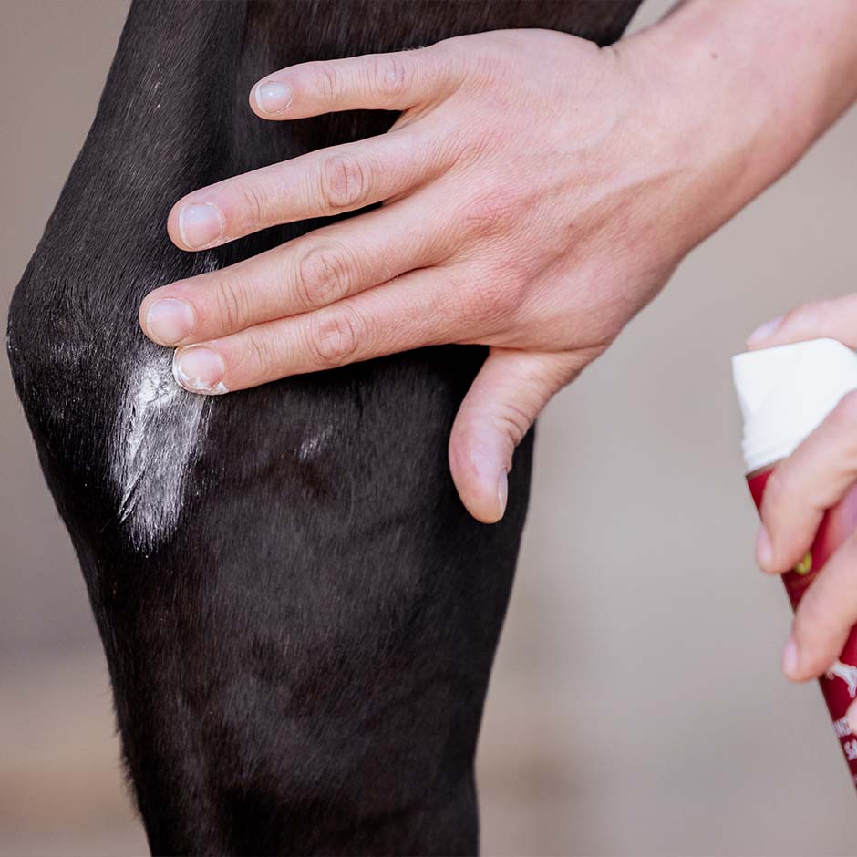 Das Fell des Pferdes anfeuchten und das Ekzemer Shampoo dünn und mit sanftem Druck einmassieren. Nach einer kurzen Einwirkzeit nochmals nachmassieren und die Stellen gründlich auswaschen.